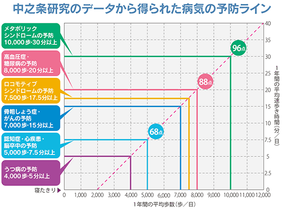 それを科学的な研究結果に基づいて、具体的な数値で明らかにしたのが中之条研究(※1)を行っている青栁博士(※2)です。多くの病気を予防できるのは、1日当たりの平均歩数が8,000歩で、その中に速歩き(中強度の活動)を20分以上行うことが効果的だと導き出しました。
